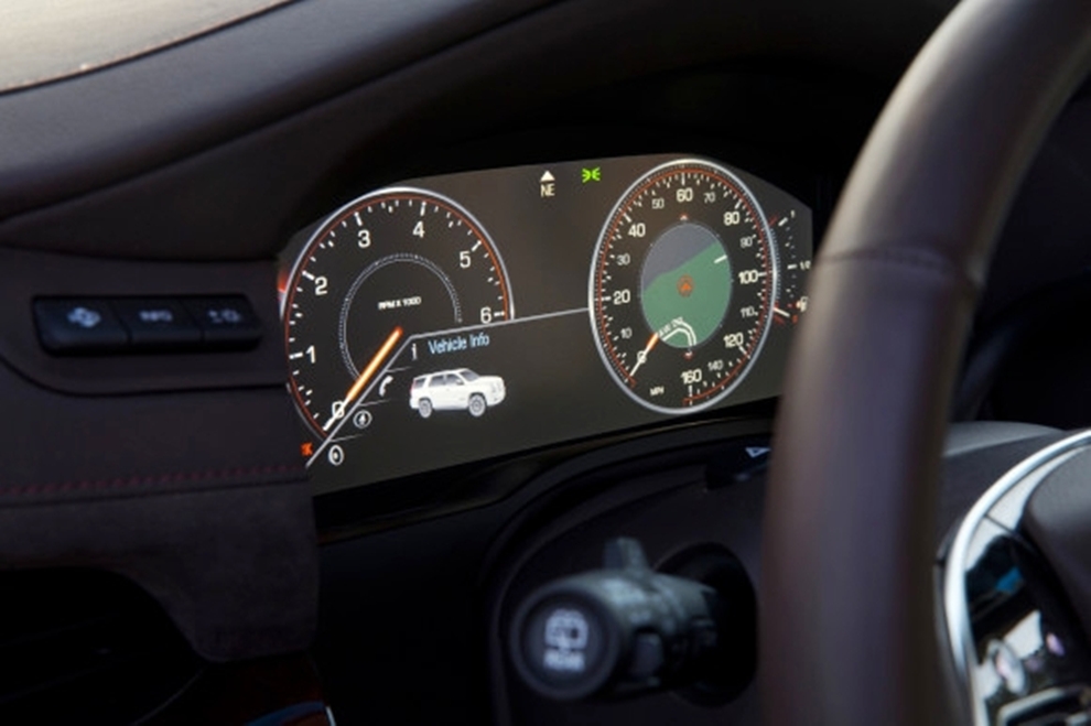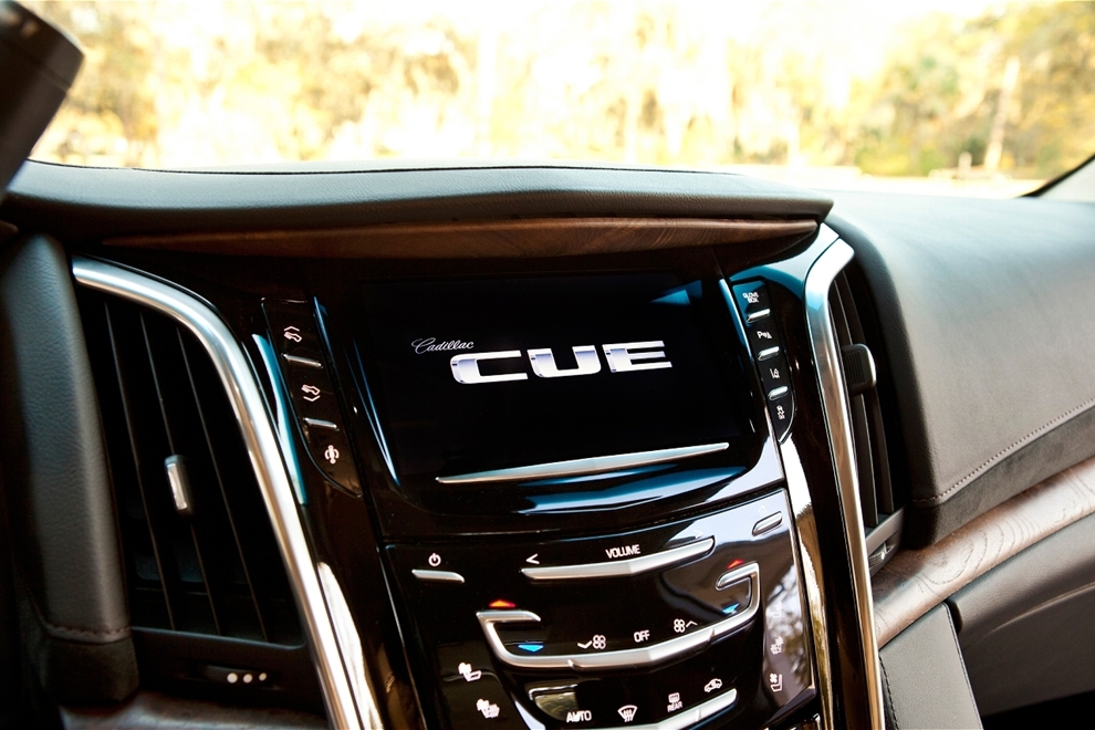 Nội thất Escalade còn tạo ấn tượng mạnh với bảng điều khiển là hệ thống màn hình cảm ứng tựa máy tính bảng CUE kích thước 12,3 inch, có khả năng kích hoạt bằng giọng nói, cử chỉ và cảm ứng điện dụng, hệ thống âm thanh BOSE. Điểm trừ duy nhất của xe chính là phần cần số có phần mất thẩm mỹ và "lạc tông" khi được đặt trên vô lăng và khá dài.